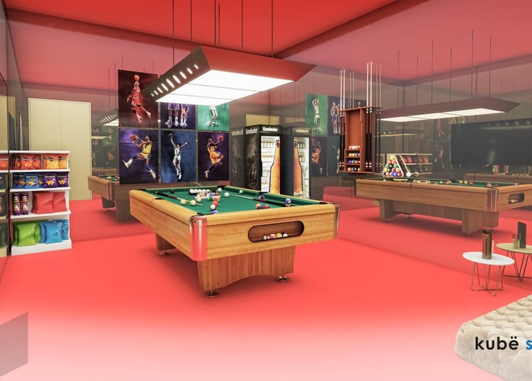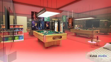 This interior design project for a Game Center in Soloturn, Switzerland, was developed to create a lively, functional, and visually appealing environment. With a surface area of 267 m², the space is designed to offer a unique experience for visitors through controlled lighting, dynamic colors, and efficient distribution of the gaming zones. The project was completed in 2022 in collaboration with the client M.G.